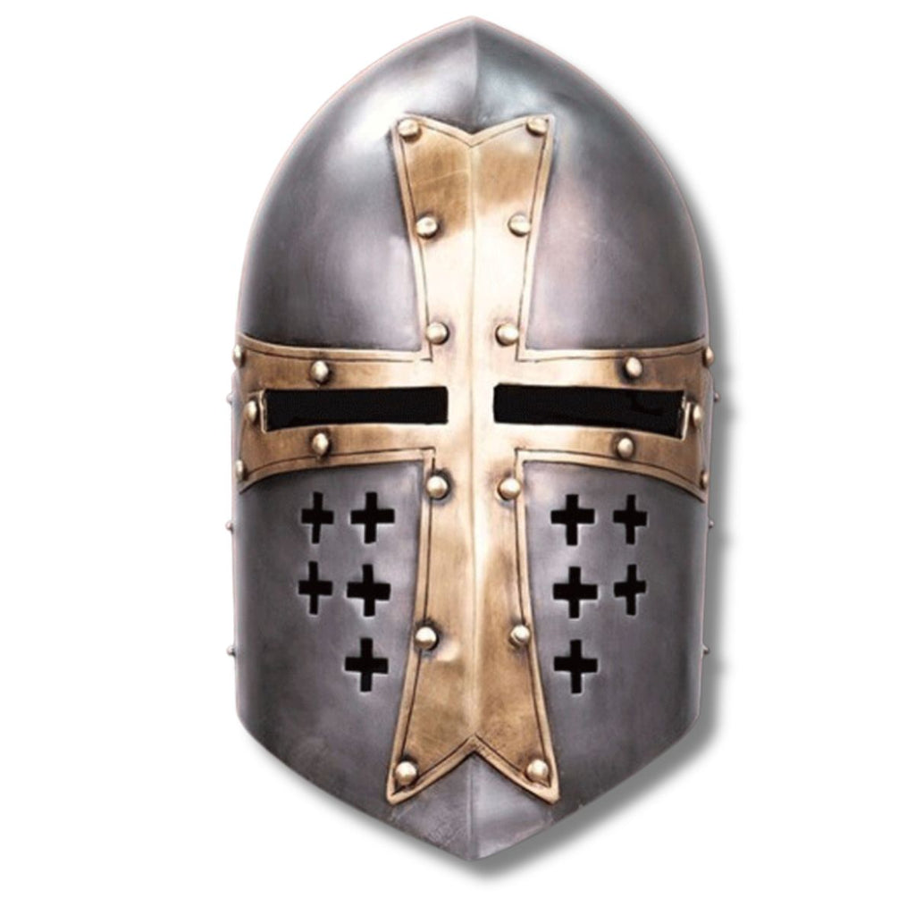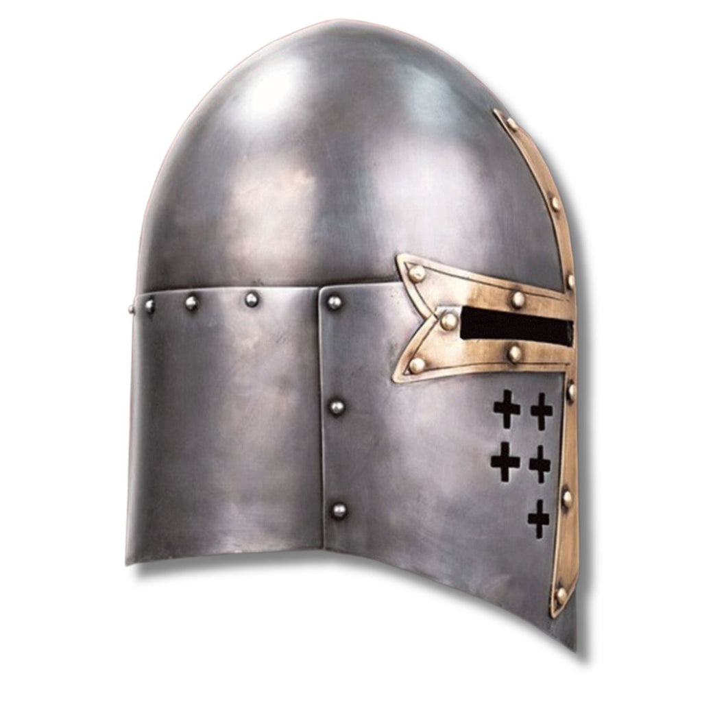 Su parte superior cónica desvía los golpes de una espada. Está decorado en todo el frente con la cruz de los Caballeros Templarios en latón envejecido. Fabricado en acero calibre 18. El casco Templario Sugarloaf va acolchado en su interior y tiene un forro ajustable suave que permite un ajuste perfecto a cualquier talla.