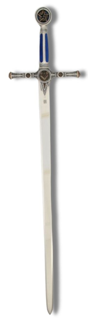 En esta singular ESPADA MASONES están recogidos una gran parte de los símbolos de la Masonería destacando el compás y la escuadra, la plomada y el martillo, el libro y ojo de Dios, y la estrella de cinco puntas enlazada con la inicial "G" de Great (Gran).