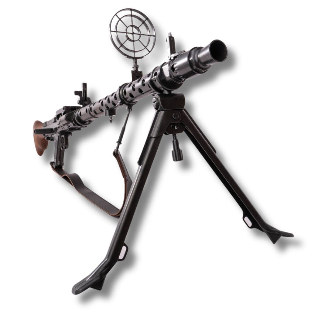 Imitación de ametralladora, fabricada en metal, madera y plástico, con mecanismo simulador de carga y disparo, bípode móvil y correa de piel.