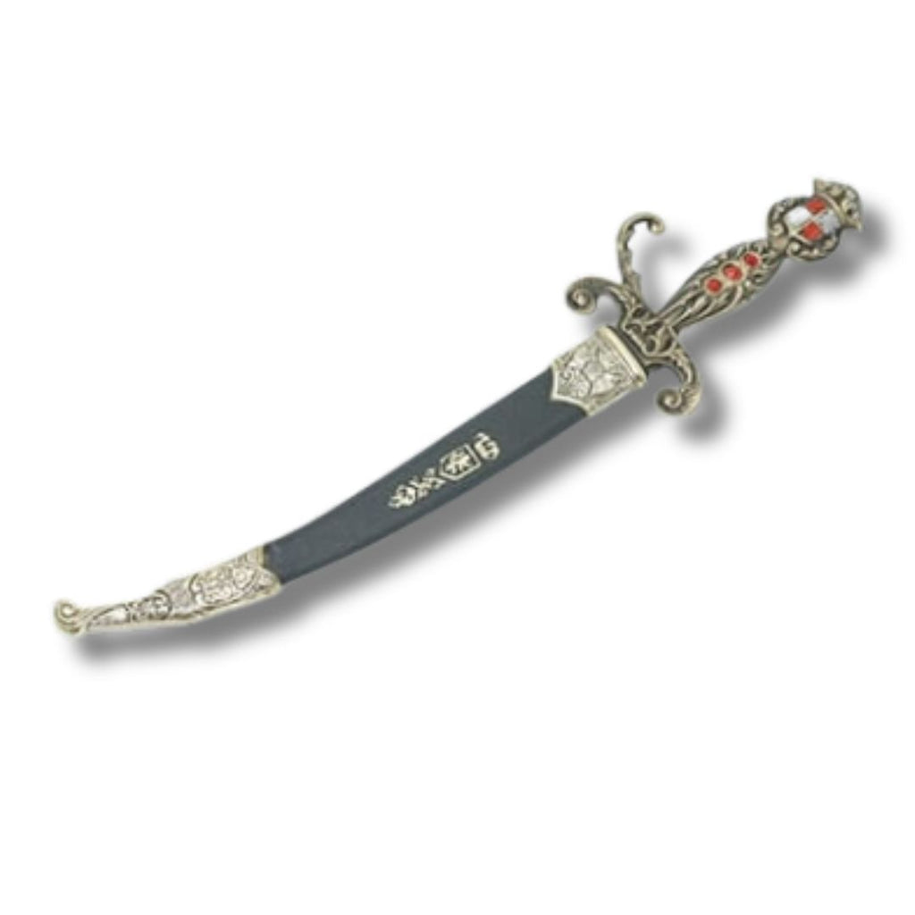 Inspirada en el arte medieval que aún perdura en la ciudad de Segovia, esta majestuosa daga, destaca por su riqueza de detalles y su carácter ornamental. Con unas dimensiones de 27 x 5 cm, presenta un pomo coronado por una figura real que enmarca un escudo medieval, una empuñadura con tres piedras incrustadas y una guarda labrada que se extiende hasta el inicio del nervio de la hoja. El conjunto se completa con un gavilán curvo a modo de guarda mano y una hoja totalmente decorada con grabados hasta su punta. La pieza está fabricada íntegramente en metal.