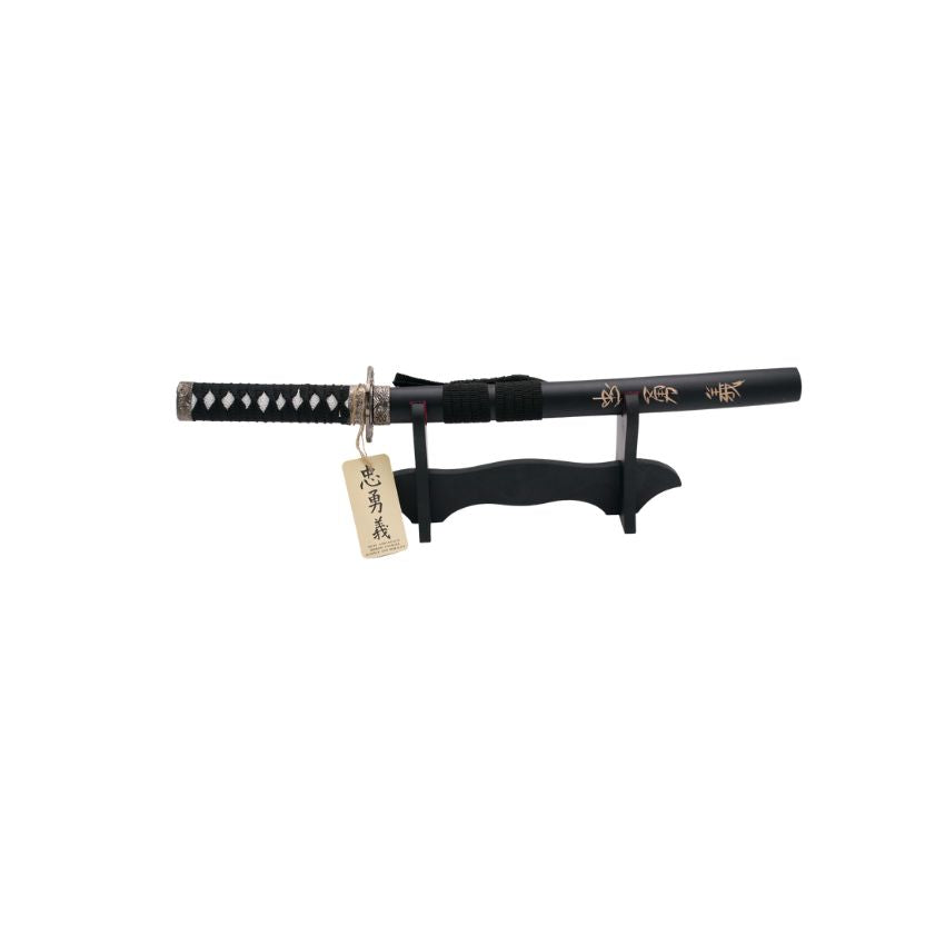 Tanto «Corage, Deber y Lealtad» vaina negra con grabado «Corage, Deber y Lealtad» de 45 cm hoja de acero, mango con encordado negro, con soporte.