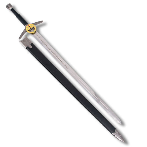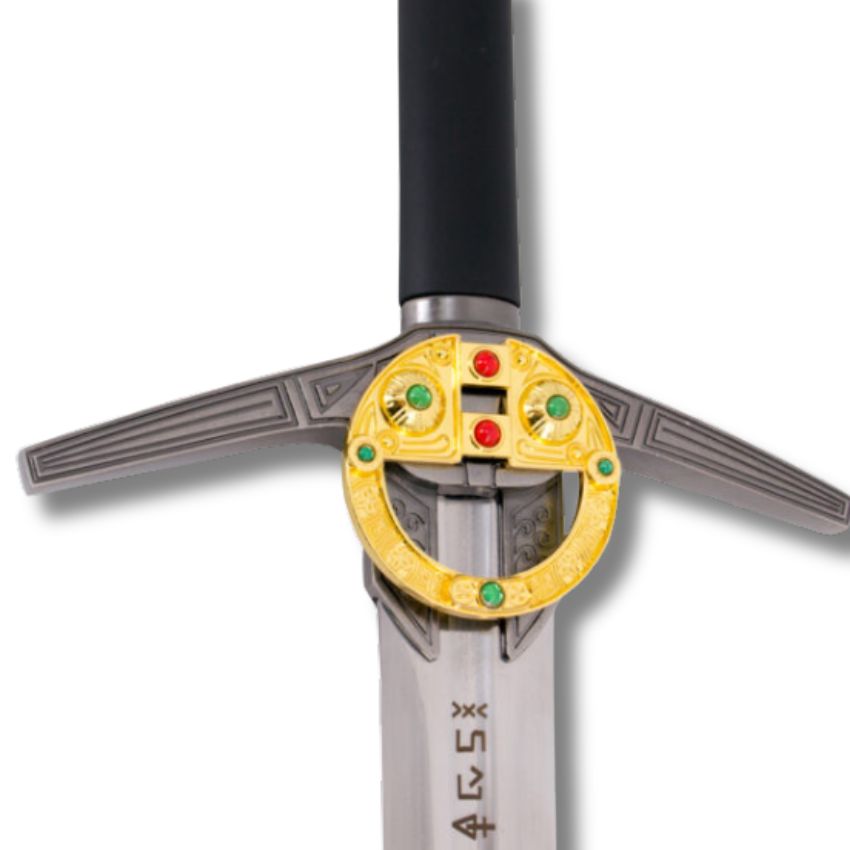 Modelo de la espada de acero de Geralt de Riva (The Witcher), es el modelo que aparece en la serie de Netflix. Con un tamaño total de 121.5 cm, en la cruz un broche dorado con piedras verdes y rojas incrustadas, hoja de acero con runas grabadas y funda de piel negra.