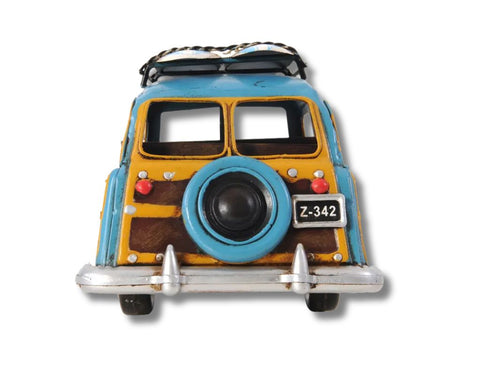 Retroceda en el tiempo con esta maqueta de Ford Woody Wagon de 1949. Un automóvil estadounidense producido por Ford Motor Company después de la Segunda Guerra Mundial. Está hecho de hierro y tiene una escala de 1:12. Presenta detalles intrincados como la matrícula, la parrilla, las ruedas, las tablas de surf y la pintura. ¡Imprescindible para coleccionistas y aficionados!