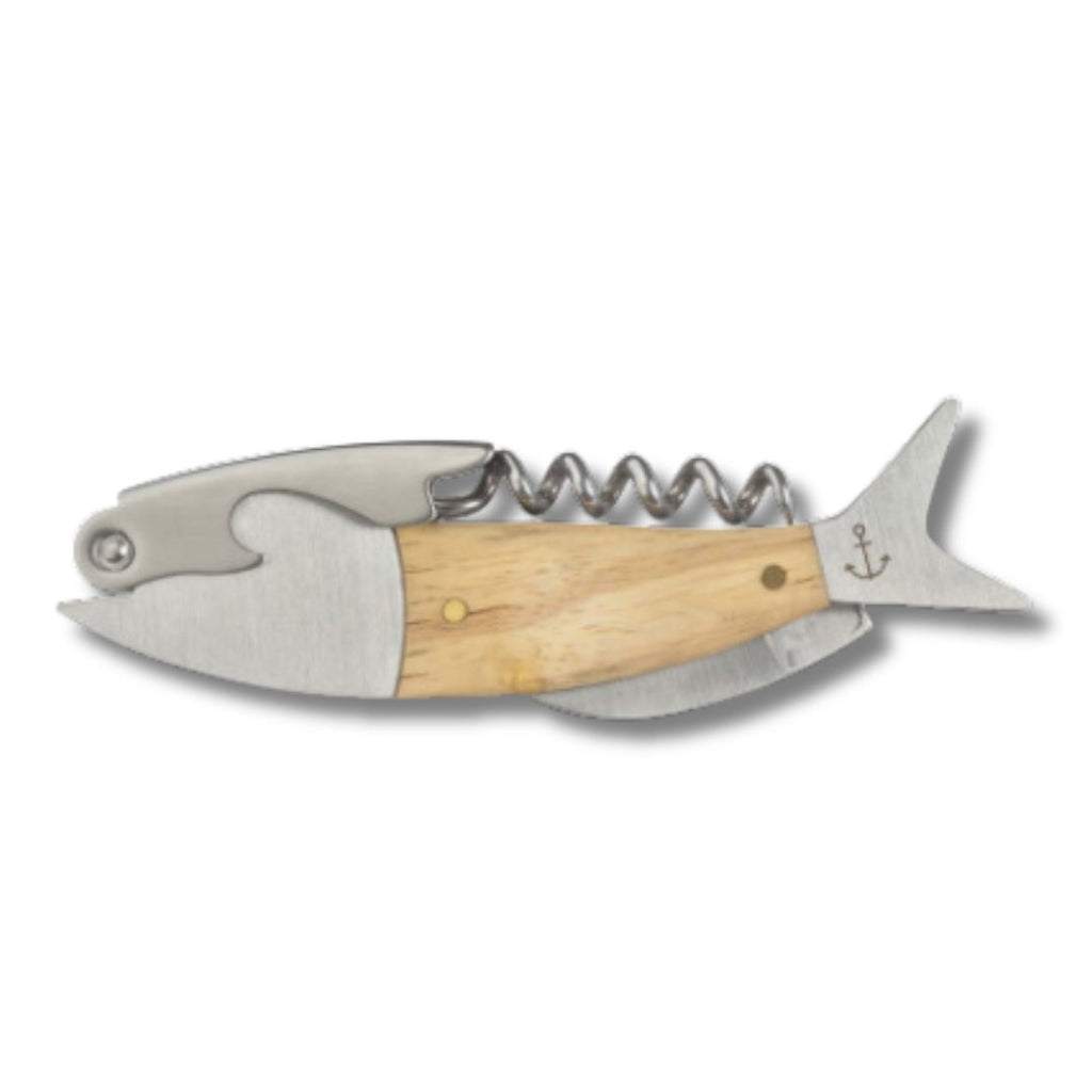 Sacacorchos multifunción – Forma de pez en metal y madera.