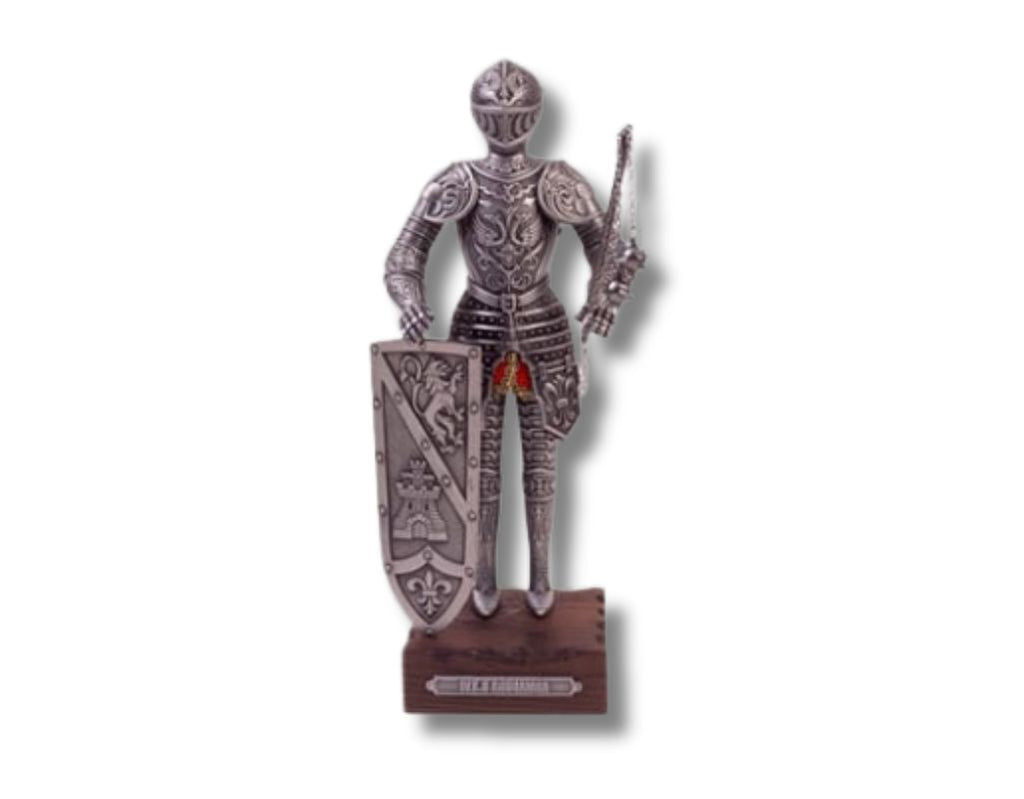 Armadura del siglo XVI decorativa, fabricada en metal con acabado envejecido que realza su apariencia realista, su medida es de 37,5 cm.