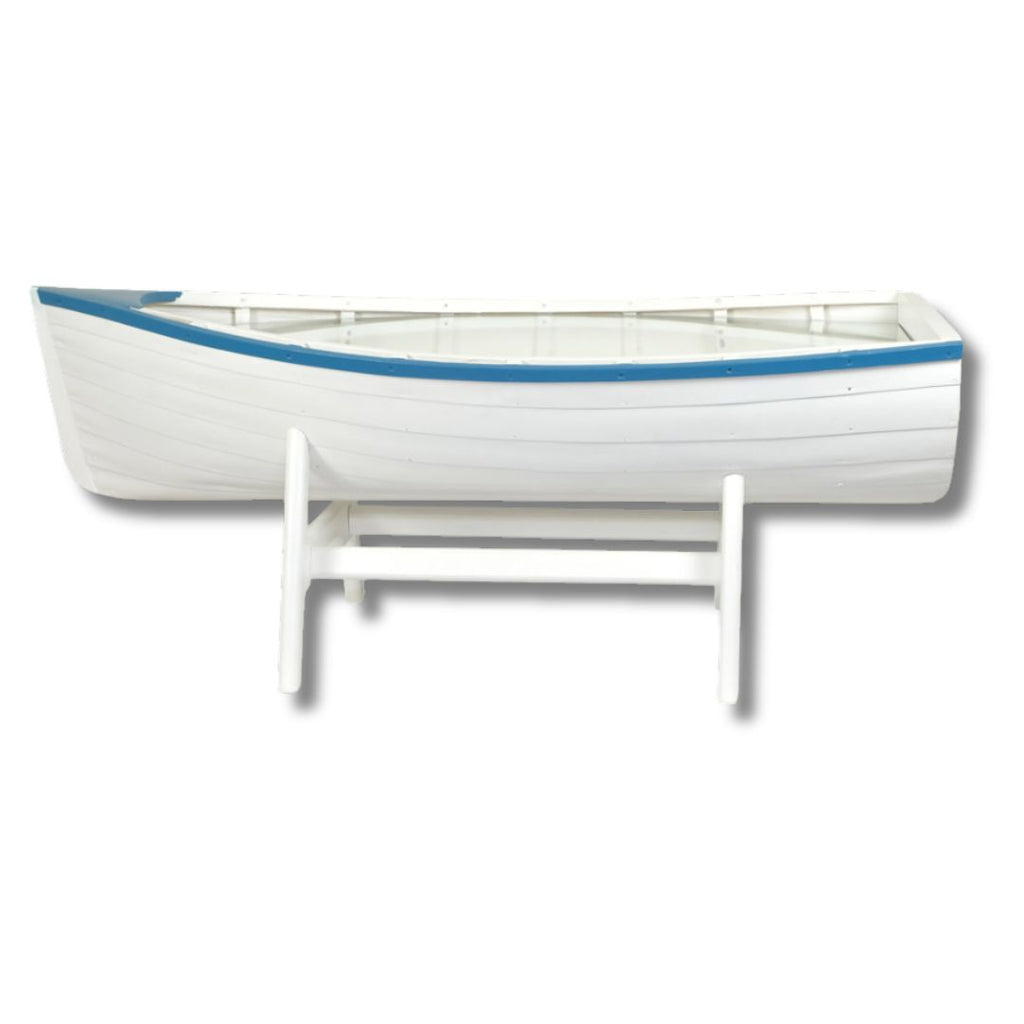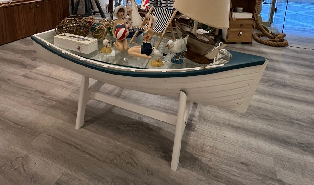 Mesita réplica de un bote de remos. A través del cristal que se utiliza de mesa, se pueden ver las membranas de la barca.