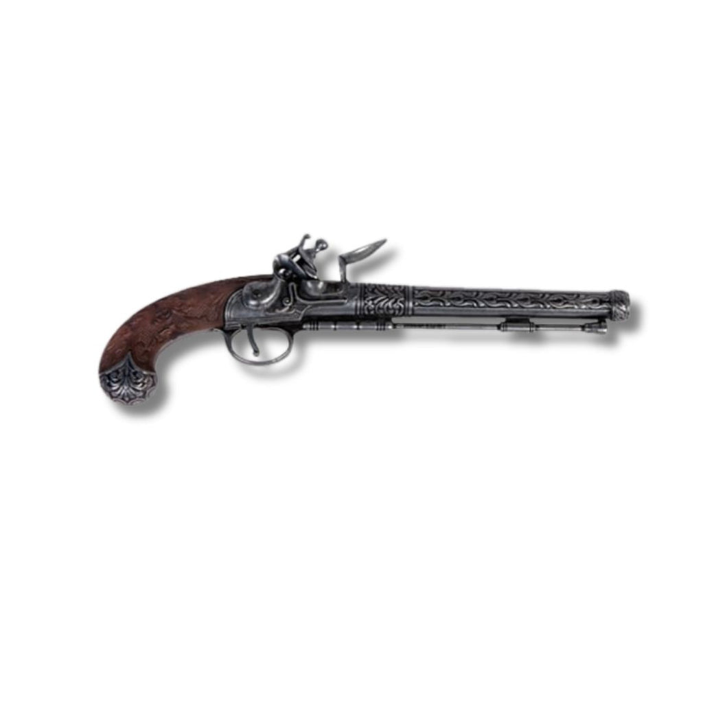 Su fabricación está realizada en metal con un tallado que va desde su gatillo hasta la boca de fuego, además, su empuñadura está hecha en resina y decorada con un tocado en metal plateado y tallado, en total, su dimensión es de 30 centímetros.
