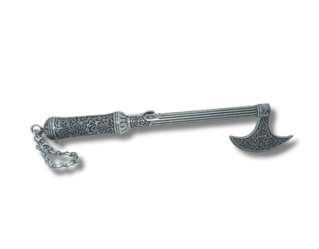Replica Pistola-Hacha Otomana es una fiel copia de una de las mejores armas de defensas que tuvo el imperio otomano, ésta hermosa Hacha otomana está fabricada por Kolser y elaborada completamente en metal de 40 centímetros de diámetro, se mantiene con una cabeza curva y completamente labrada, conserva la tipicidad del arte utilizado en el imperio. Su empuñadura resalta igualmente por su bello labrado y un agarre particular mallado que sobresale del mango.