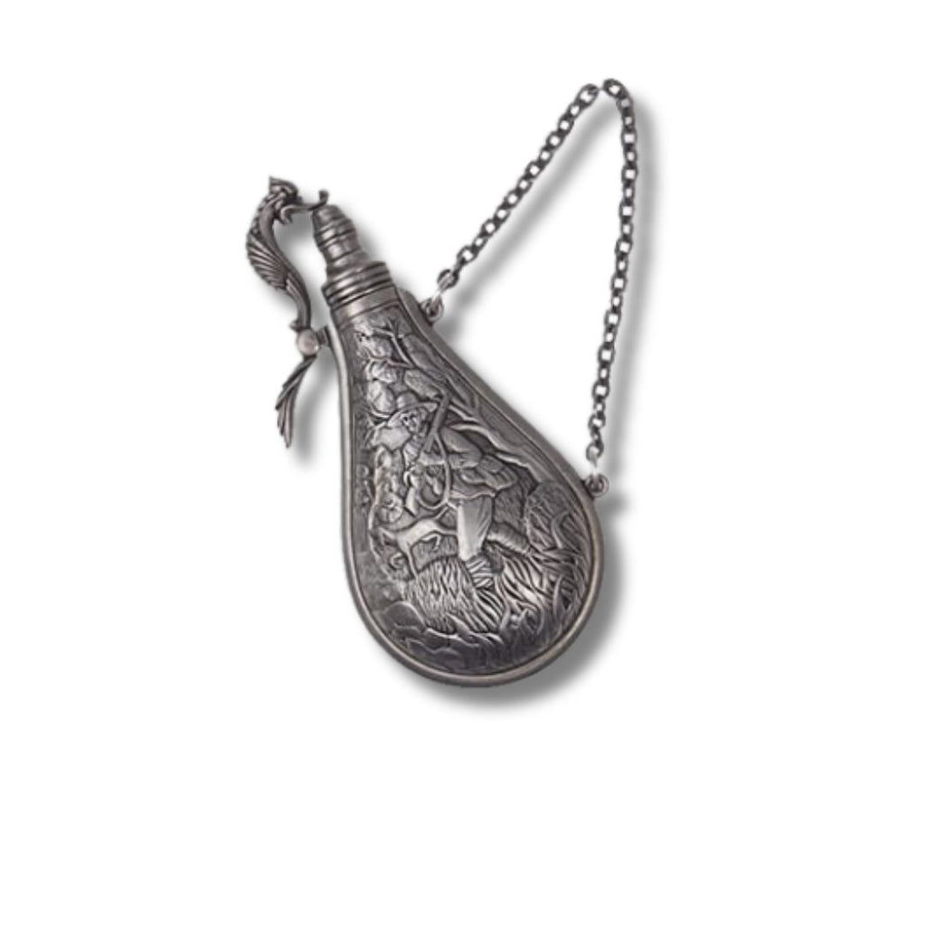 Con unas dimensiones de 18 x 10 centímetros, esta polvorera con forma de bota destaca por su acabado metálico envejecido y por los detalles minuciosos que Kolser ha incorporado en su diseño. Se trata de una pieza con personalidad propia, inspirada en los accesorios tradicionales que acompañaban las armas de chispa.